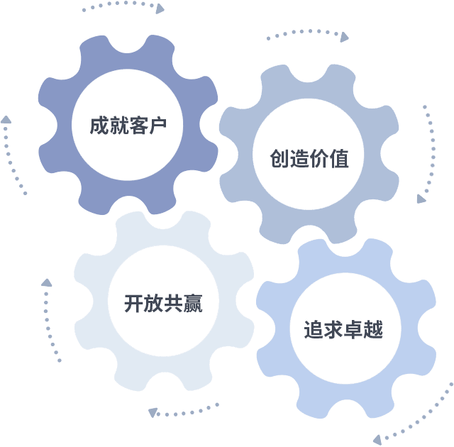 成就客户是一切决策的出发点,,,创造价值是衡量所有工作的标准,,追求卓越是我们做事做人的态度,,,,开放共赢是我们的格局也是最终的结果。。。价值观的齿轮环环相扣,,,推动着组织里的每个人不断向前。。。